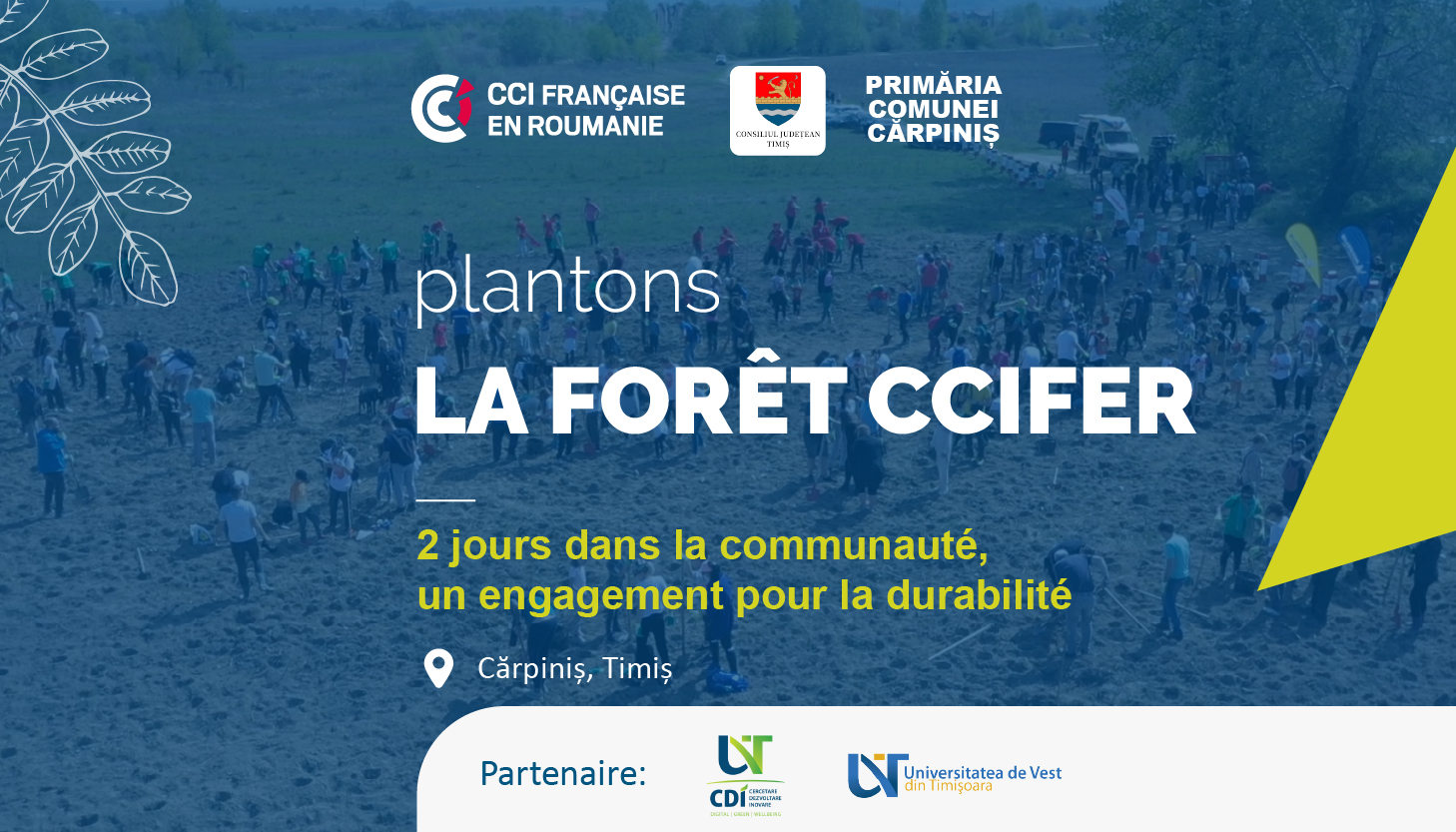 Universitatea de Vest din Timișoara invită studenții, cadrele didactice și membrii comunității UVT să participe la acțiunea de plantare organizată sâmbătă, 22 noiembrie 2025, în localitatea Cărpiniș (jud. Timiș), în cadrul proiectului „Pădurea CCIFER”, inițiat de Camera de Comerț, Industrie și Agricultură Franceză în România (CCIFER), în parteneriat cu Consiliul Județean Timiș.