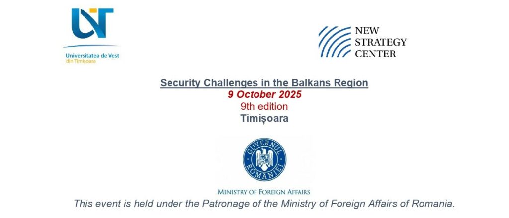 Universitatea de Vest din Timișoara (UVT), alături de New Strategy Center, vă invită să participați la a noua ediție a conferinței internaționale „Security Challenges in the Balkans”, eveniment de referință dedicat dialogului strategic și analizelor de securitate regională care se va desfășura la Timișoara, în data de 9 octombrie 2025, la Complex Senator (Calea Lugojului nr.7). Într-un context geopolitic în continuă schimbare, ediția din acest an aduce în prim-plan provocările de securitate din spațiul balcanic, prin perspectiva unor experți de top, diplomați, decidenți și reprezentanți ai mediului academic.