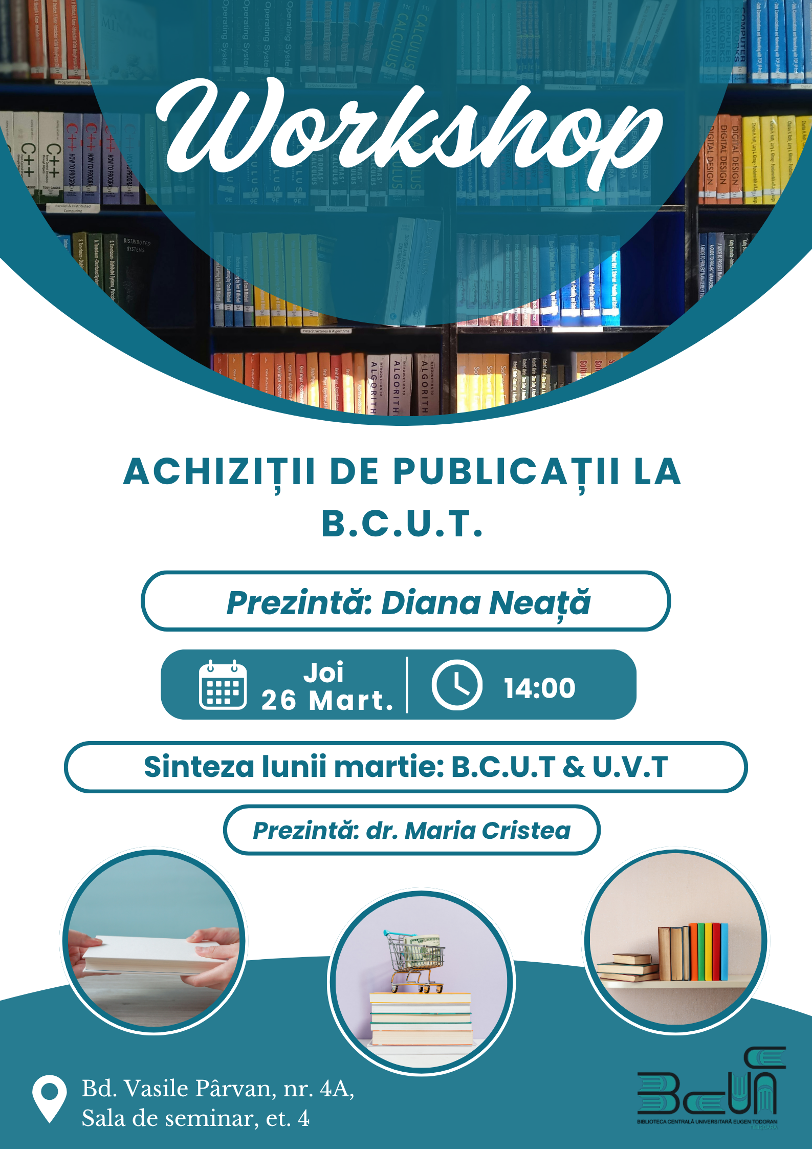 Biblioteca Centrală Universitară „Eugen Todoran” vă invită joi, 26 martie de la ora 14:00 la workshop-ul intitulat „Achiziții de publicații la B.C.U.T.”, susținut de Diana Neață.