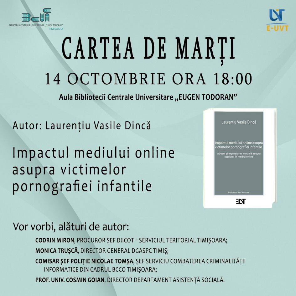 Biblioteca Centrală Universitară „Eugen Todoran” din Timişoara vă invită să participați la evenimentul intitulat „Cartea de marți”, din data de 14.10.2025, la ora 18:00, susținut în Aula bibliotecii.