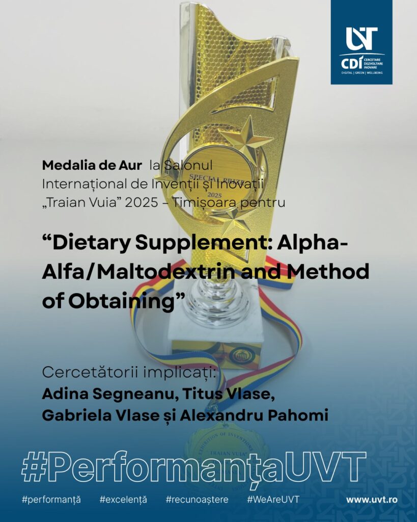 Centrul de Inovare și Transfer Tehnologic adresează cele mai sincere felicitări cercetătorilor Adina Segneanu, Titus Vlase, Gabriela Vlase și Alexandru Pahomi pentru rezultatele obținute în cadrul Salonului Internațional de Invenții și Inovații „Traian Vuia” Timișoara, desfășurat în perioada 3–4 octombrie 2025.