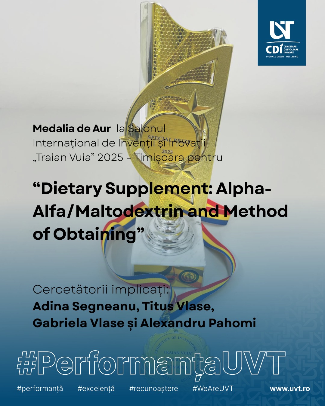 Echipa de cercetători a câștigat Medalia de Aur 🥇 pentru invenția intitulată „Dietary Supplement: Alpha-Alfa/Maltodextrin and Method of Obtaining”, o lucrare inovatoare cu aplicabilitate în domeniul suplimentelor alimentare și al științelor vieții.