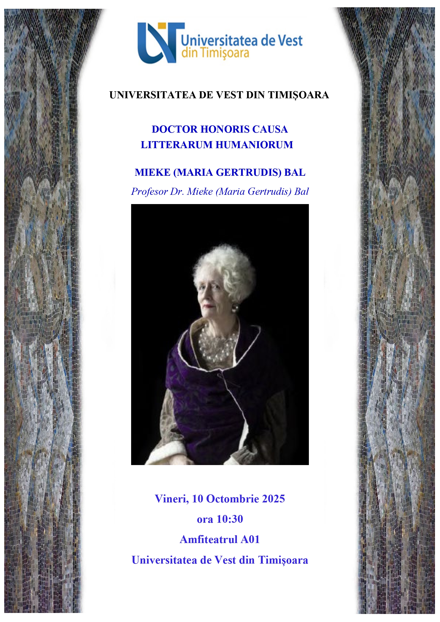 Vineri, 10 octombrie, de la ora 10.30, Amfiteatrul A01 al UVT va găzdui ceremonia de acordare a titlului de Doctor Honoris Causa Litterarum Humaniorum Distinsei Doamne Profesor Dr. Mieke Bal, eveniment care se înscrie într-un lung șir de dialoguri la cel mai înalt nivel între Universitatea de Vest din Timișoara și personalități marcante ale culturii mondiale.