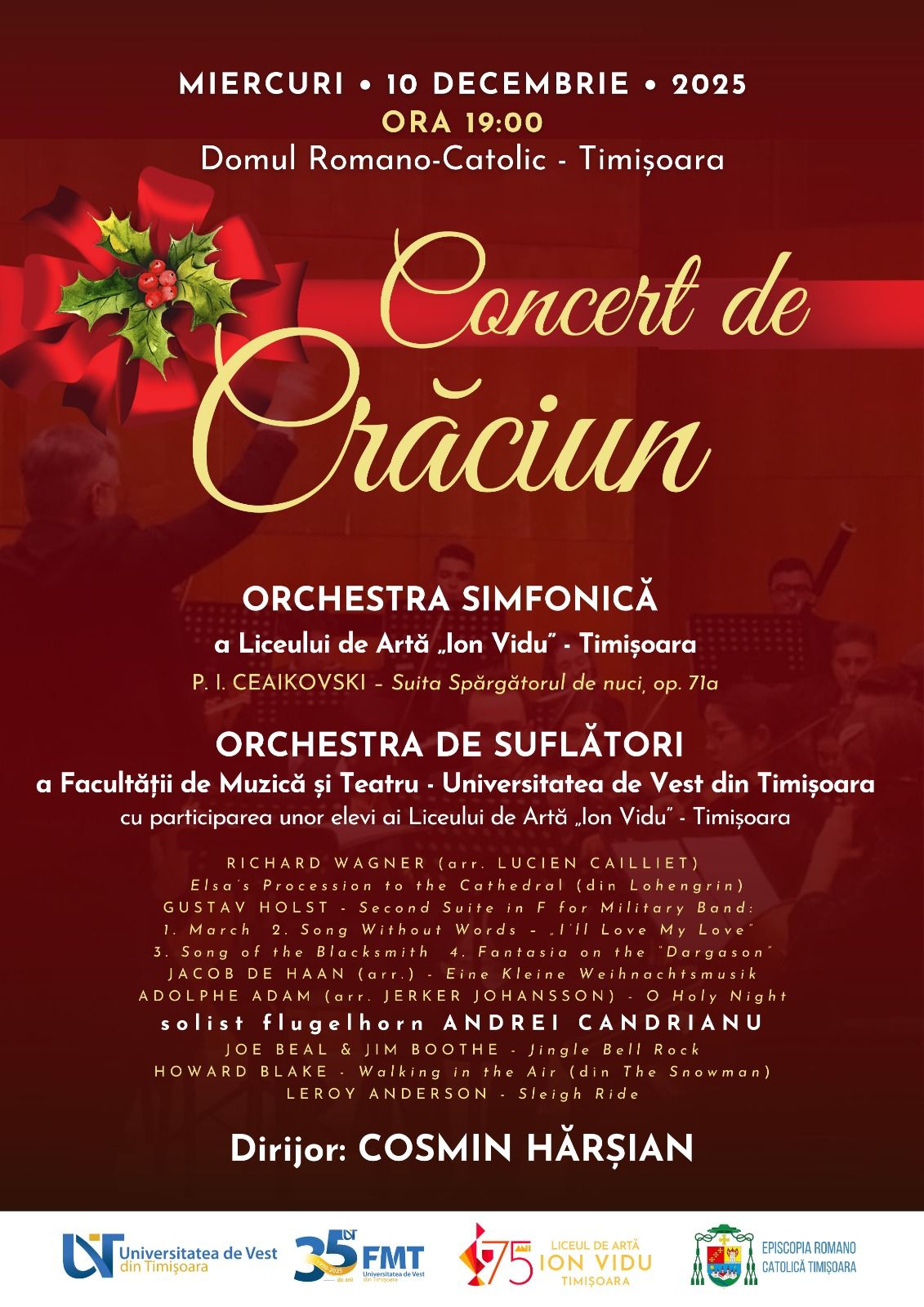 Spiritul sărbătorilor va fi celebrat miercuri, 10 decembrie 2025, de la ora 19:00, în atmosfera solemnă a Domului Romano-Catolic din Piața Unirii, printr-un program simfonic de excepție.