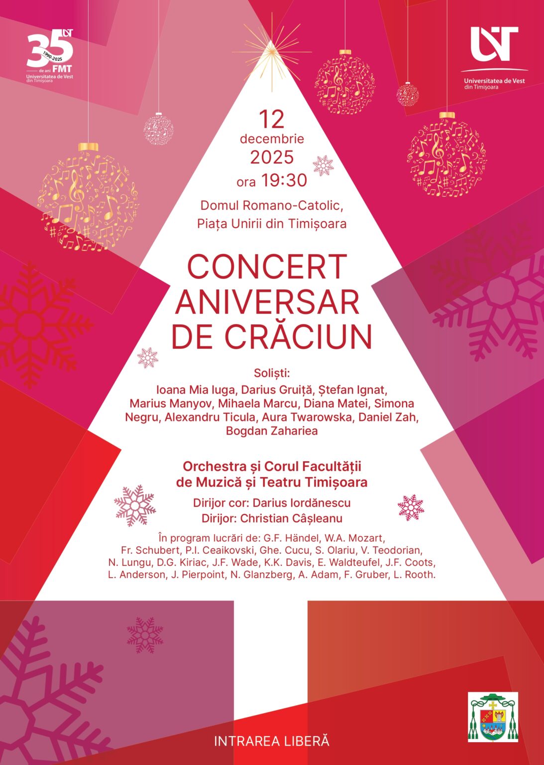 Facultatea de Muzică și Teatru a UVT, vă invită la Concertul Aniversar de Crăciun cu ocazia celebrării celor 35 de ani de excelență artistică, vineri, 12 decembrie, ora 19:30, la Domul Romano-Catolic din Timișoara.