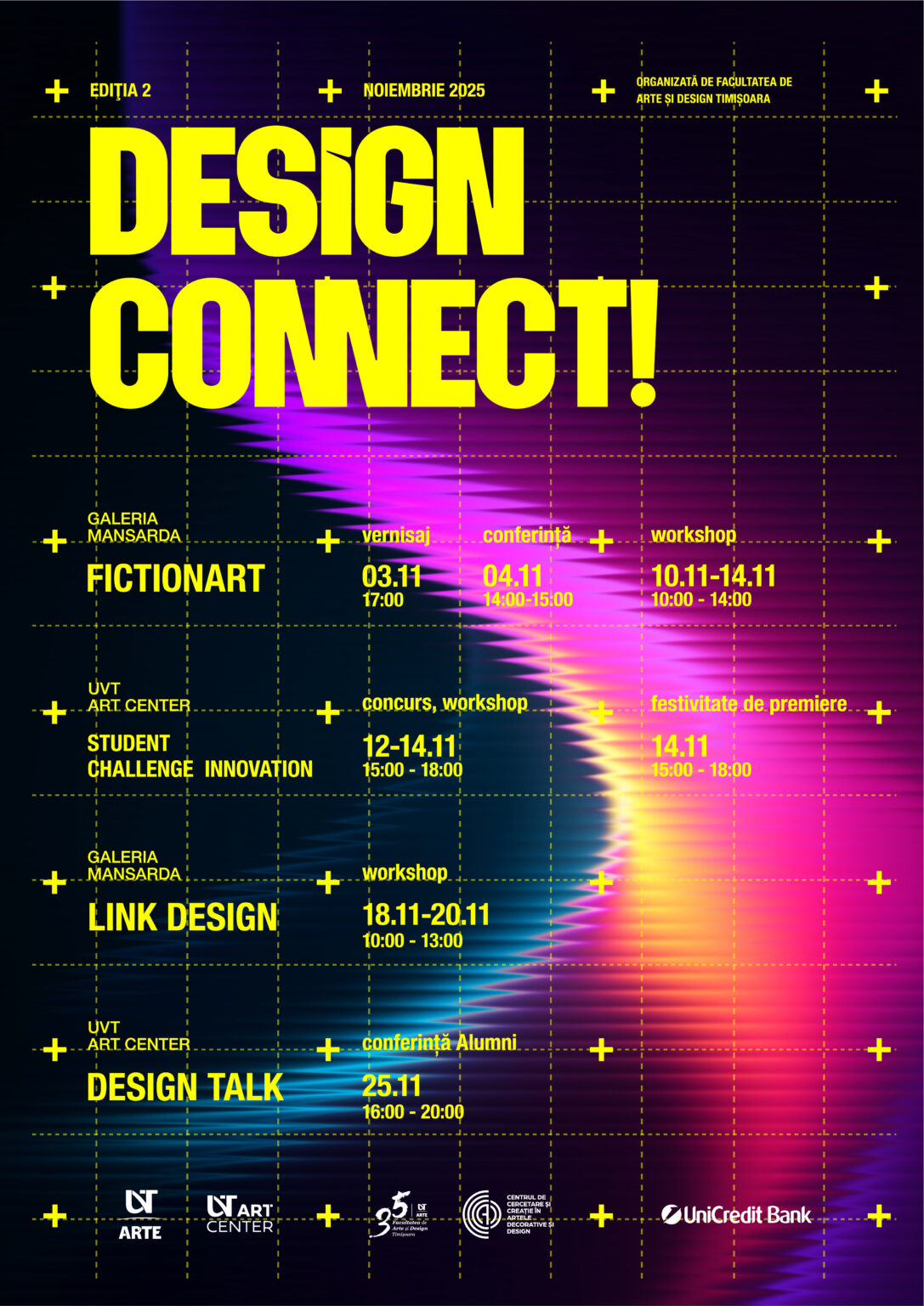 Ediția din acest an propune un program variat și captivant, dedicat designului și inovației, care se va desfășura pe tot parcursul lunii noiembrie, la Facultatea de Arte și Design din cadrul Universității de Vest din Timișoara. Evenimentul reunește profesioniști, studenți și pasionați de domeniu, oferind oportunități unice de dialog, inspirație și dezvoltare. „Design Connect”, o platformă pentru viitorul designului, creat în 2024 ca un spațiu dedicat colaborării, inovației și educației vizuale, a devenit rapid o tradiție care conectează generațiile și disciplinele creative. Ediția #2 continuă acest demers printr-o serie de proiecte, expoziții și întâlniri ce explorează rolul designului în societatea contemporană și în transformarea mediilor vizuale.