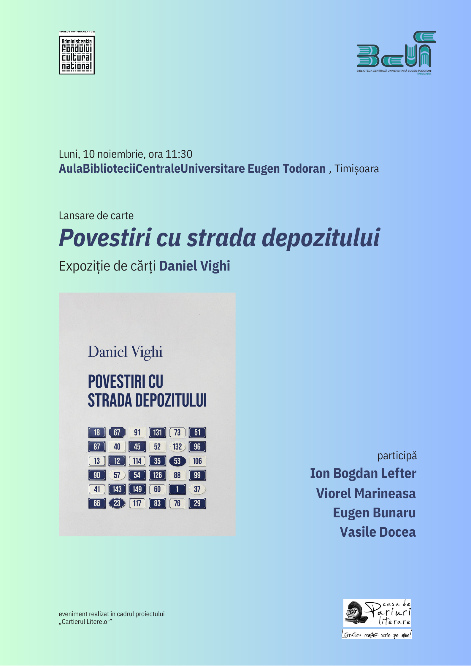 La ora 11:30, în Aula bibliotecii, va avea loc evenimentul cu titlul „O nouă ediție a volumului Povestiri cu strada depozitului și expoziție de cărți semnate de Daniel Vighi”.