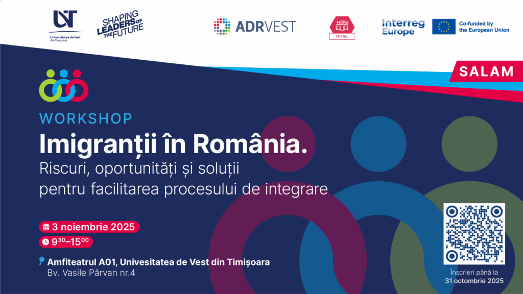 Universitatea de Vest din Timișoara (UVT), în colaborare cu Agenția pentru Dezvoltare Regională Vest (ADR Vest) și Instituția Prefectului – Județul Timiș organizează workshop-ul „Imigranții în România. Riscuri, oportunități și soluții pentru facilitarea procesului de integrare”.
