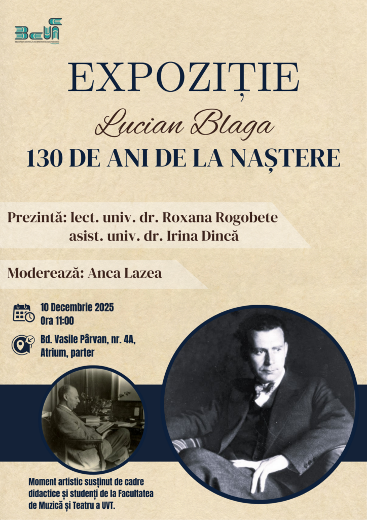 Biblioteca Centrală Universitară „Eugen Todoran” vă invită miercuri, 10.12.2025, de la ora 11:00, la inaugurarea expoziției „Lucian Blaga, 130 de ani de la naștere”, în Atriumul bibliotecii.