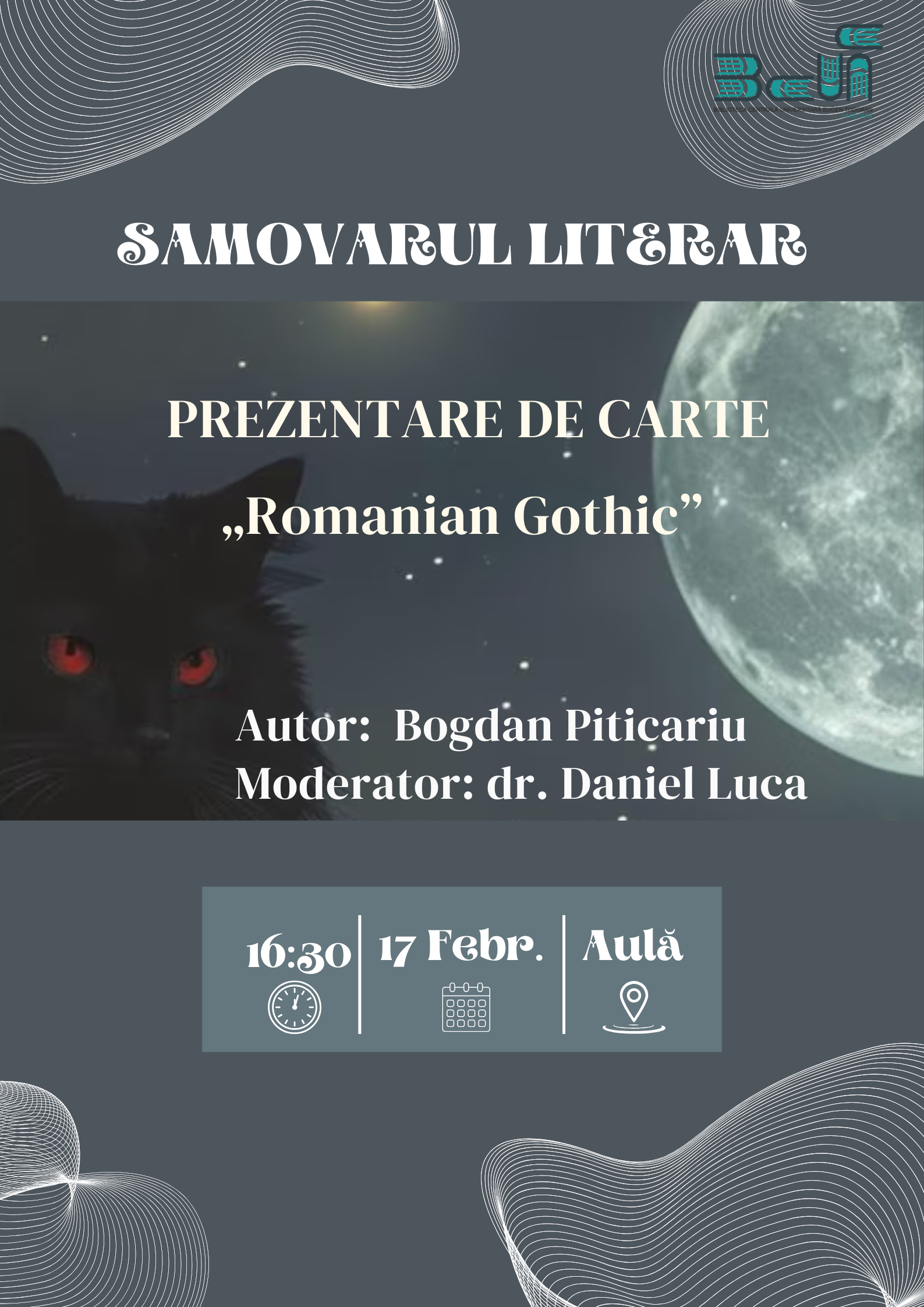 De asemenea, în data de 17 februarie 2026, de la ora 16:30, sunteți așteptați la prezentarea de carte „Romanian Gothic”, organizată în cadrul evenimentului „Samovarul Literar”, ce va avea loc în tot Aulă.