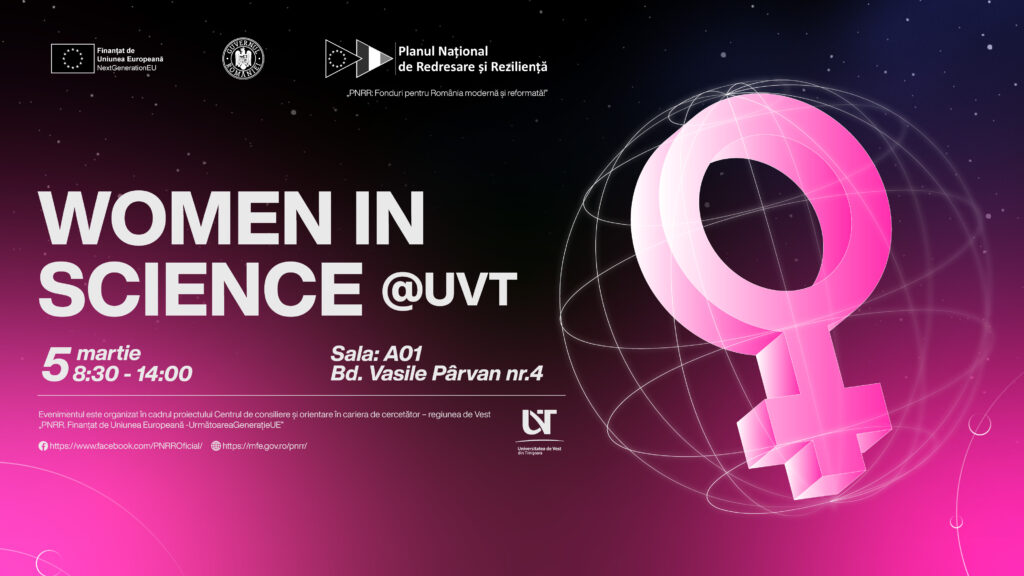 În cadrul Research, Innovation & Tech Transfer Days (RITT Days), Universitatea de Vest din Timișoara, împreună cu Centrul de Consiliere și Orientare în Cariera de Cercetător – regiunea de Vest (CeCOCe-Vest), organizează prima ediție a evenimentului Women in Science@UVT, o inițiativă dedicată recunoașterii excelenței feminine în cercetare și stimulării dialogului academic în comunitatea UVT.