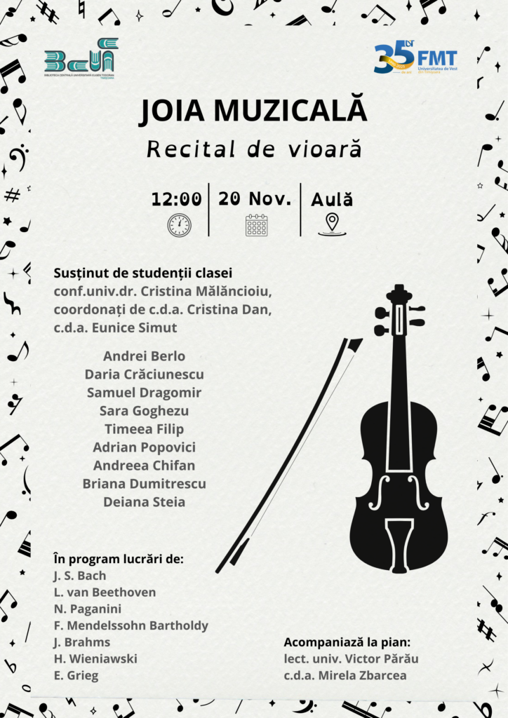 Biblioteca Centrală Universitară „Eugen Todoran” vă invită joi, 20 noiembrie 2025, de la ora 12:00, la un recital de pian în cadrul evenimentului „Joia muzicală”, în aula bibliotecii.