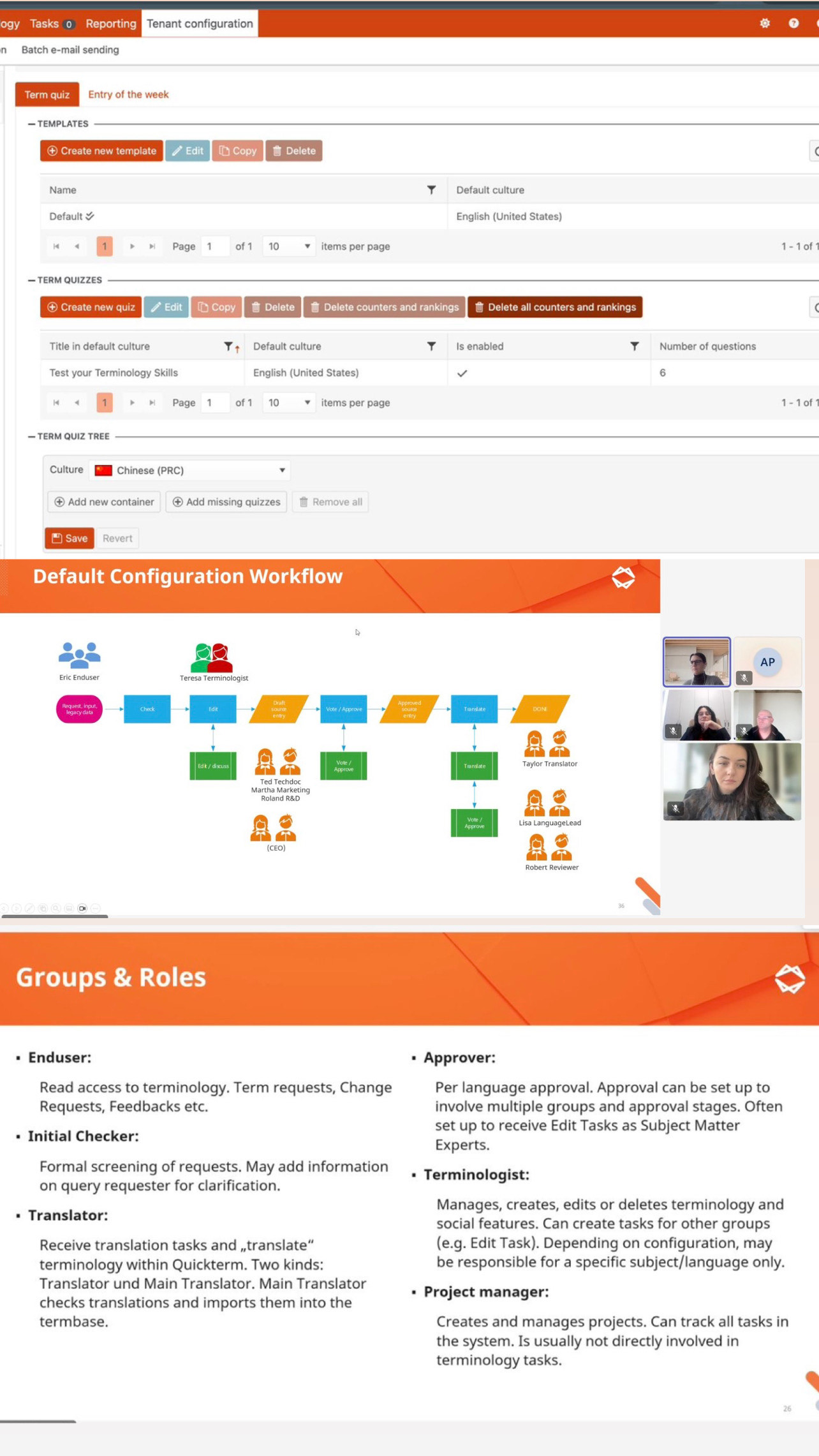Formatorii implicați au fost pregătiți pentru utilizarea platformei în scopuri didactice, astfel încât activitățile de terminologie și traducere să poată fi coordonate și monitorizate într-o singură interfață, prin distribuirea rolurilor specifice, gestionarea fluxurilor de lucru și centralizarea deciziilor terminologice. Platforma va permite dezvoltarea competențelor necesare profesiei de traducător: gestionarea etapelor de lucru, colaborarea cu actori diferiți ai procesului de traducere, identificarea și validarea resurselor terminologice și coordonarea fluxului de traducere în timp real.