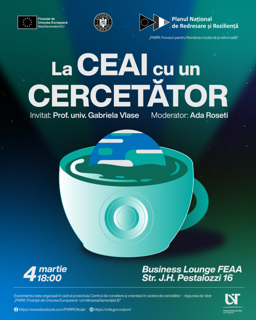 Te invităm la o seară relaxată, în care vom avea o conversație sinceră despre știință, cum o aducem mai aproape de oameni și care este rolul cercetătorului în societate. Evenimentul „La ceai cu un cercetător”, organizat în cadrul Research and Innovation Days UVT 2026 de către CeCOCe-Vest (Centrul de Consiliere și Orientare în Cariera de Cercetător – regiunea de Vest), creează un spațiu de dialog direct între cercetători și comunitate.