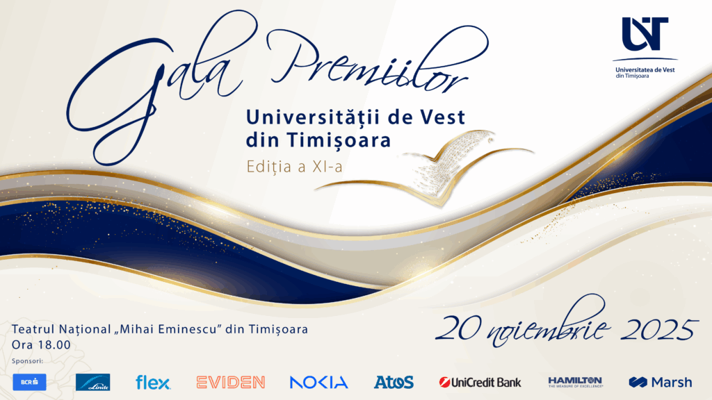 Comunitatea academică a Universității de Vest din Timișoara (UVT) s-a reunit în seara de 20 noiembrie 2025, în spațiul elegant al Teatrului Național „Mihai Eminescu” din Timișoara, pentru a recunoaște meritele și performanțele remarcabile ale membrilor săi. Împreună, invitați din comunitate, reprezentanți ai partenerilor instituționali, cadre didactice, studenți și cercetători, au sărbătorit excelența și performanțele universitare în cadrul Galei Premiilor UVT 2025.