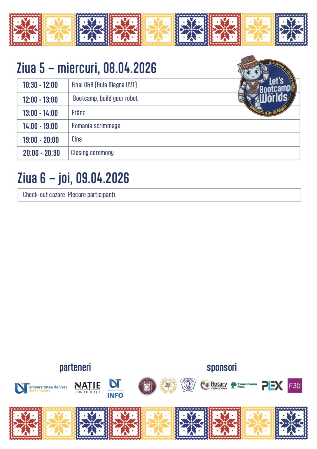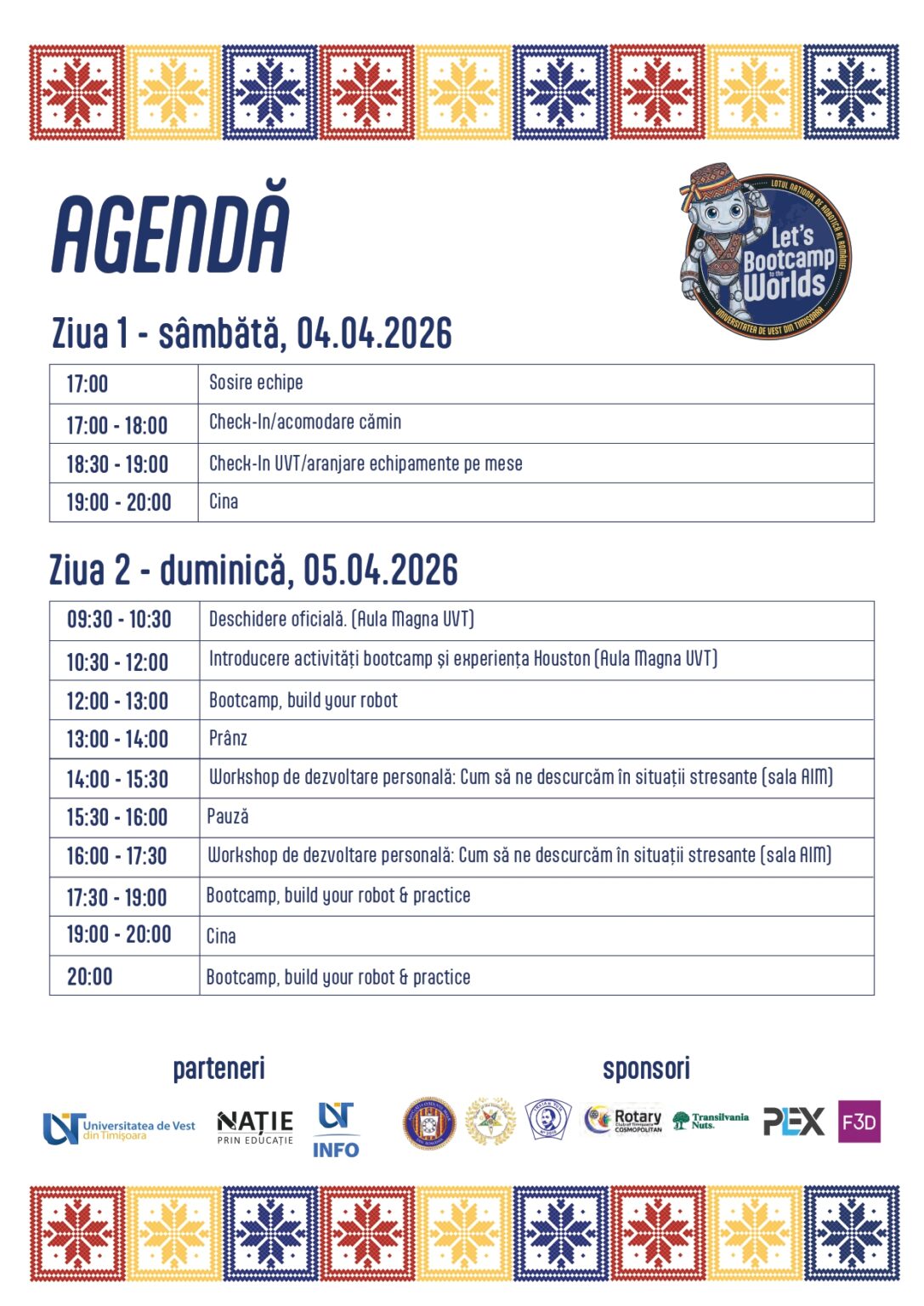 Universitatea de Vest din Timișoara (UVT) va organiza și va găzdui, alături de Asociația Nație Prin Educație, în perioada 4-9 aprilie 2026, evenimentul „Let’s Bootcamp to the Worlds”, ediția I, un program de pregătire dedicat celor mai bune opt echipe de robotică din România, calificate la etapa mondială a competiției mondiale „FIRST Tech Challenge”.