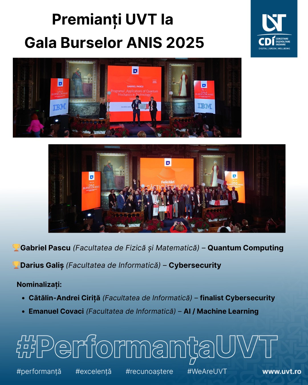 Suntem onorați să îi felicităm pe colegii noștri, Gabriel Pascu, de la Facultatea de Fizică și Matematică din UVT, și Darius Galiș, de la Facultatea de Informatică din UVT, distinși la Gala Burselor ANIS 2025. Gabriel Pascu a fost premiat la secțiunea „Quantum Computing”, iar Darius Galiș la secțiunea „Cybersecurity”, întrunind astfel recunoașteri care confirmă excelența și potențialul tinerilor cercetători UVT în domeniile tehnologice emergente.