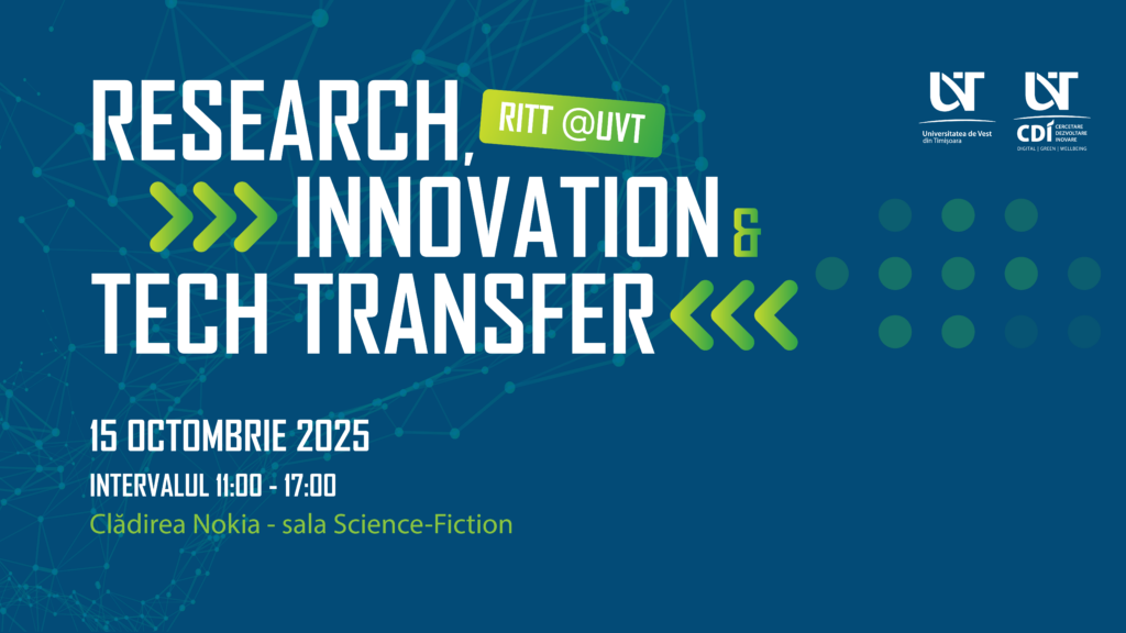 Universitatea de Vest din Timișoara, prin Centrul de Inovare și Transfer Tehnologic, împreună cu CeCOCe Vest și Direcția pentru Managementul Activităților de Cercetare-Dezvoltare-Inovare, vă invită să participați la „Research, Innovation & Tech Transfer Day @ UVT” – un eveniment dedicat promovării cercetării aplicative, inovării deschise și colaborării între mediul academic și sectorul privat.