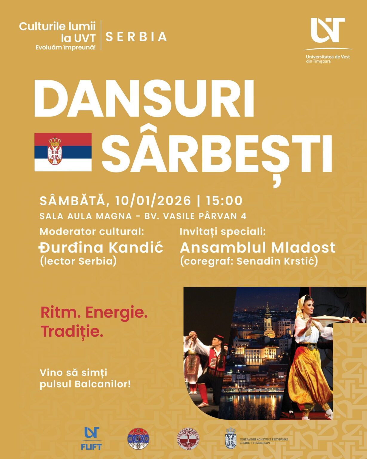 Sâmbătă, 10 ianuarie, începând de la ora 15:00, în Aula Magna UVT, a avut loc un spectacol de dansuri sârbești susținut de Ansamblul Mladost (coregraf: Senadin Krstić), o explozie de ritm și energie, eveniment moderat de Đurđina Kandić, lector de limba sârbă.