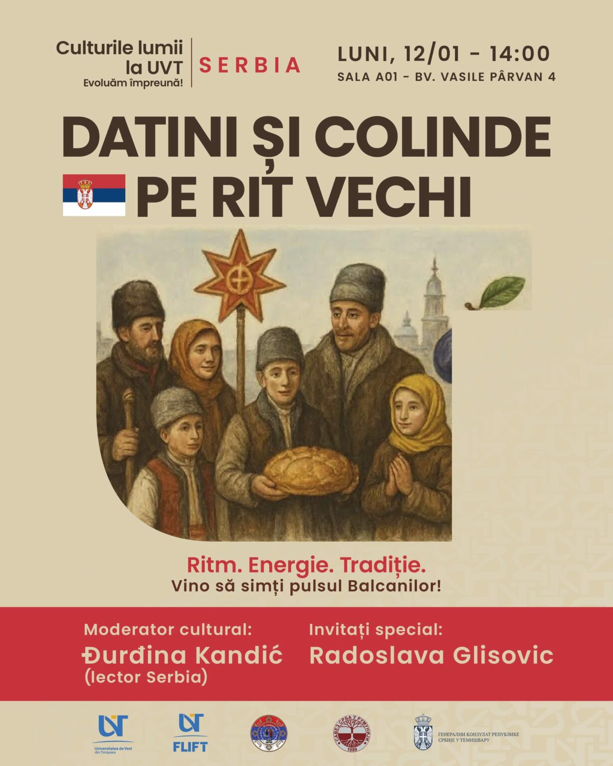 Luni, 12 ianuarie, începând de la ora 14:00, în amfiteatrul A01, va avea loc spectacolul de datini și colinde pe rit vechi, o incursiune în tradițiile de iarnă ale Serbiei, cu invitați speciali și povești despre identitate, obiceiuri și patrimoniu cultural.