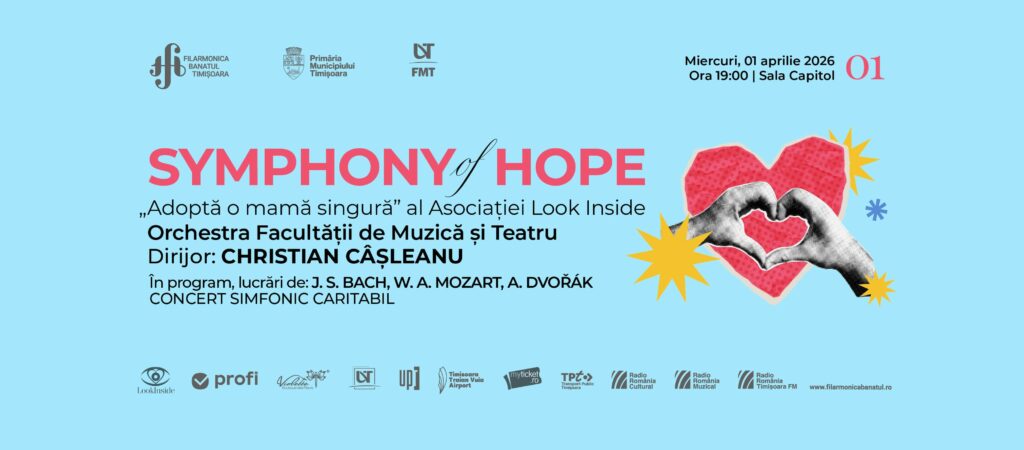 Miercuri, 1 aprilie 2026, ora 19:00, în Sala Capitol a Filarmonicii Banatul din Timișoara, Facultatea de Muzică și Teatru din cadrul Universității de Vest din Timișoara (UVT) invită publicul la „Symphony of Hope” – un concert simfonic cu scop caritabil, dedicat sprijinirii campaniei „Adoptă o mamă singură”, inițiată de Asociația Look Inside și coordonată de Miclea Alina Elena.