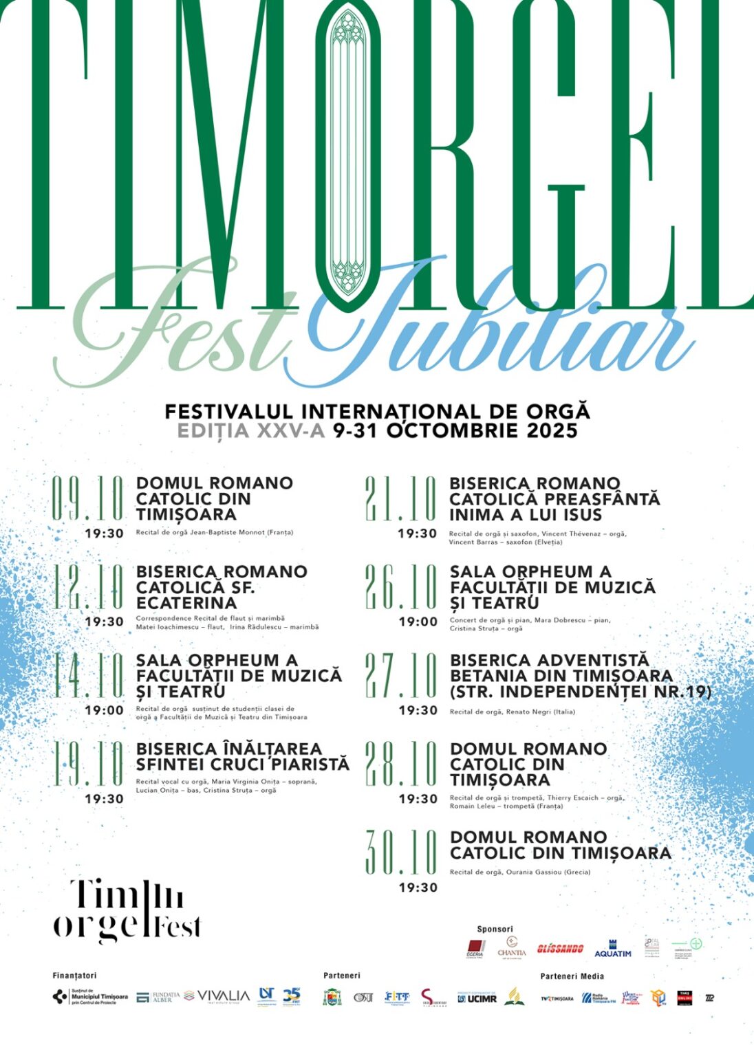 Festivalul Internațional de Orgă TimOrgelFest, ajuns la ediția jubiliară a XXV-a, sărbătorește în acest an un sfert de secol de existență și își confirmă statutul de tradiție a lunii octombrie în orașul de pe Bega. Cu fiecare ediție, TimOrgelFest se reinventează, păstrând echilibrul dintre tradiție și inovație și reunind artiști de prestigiu internațional în concerte de neuitat.