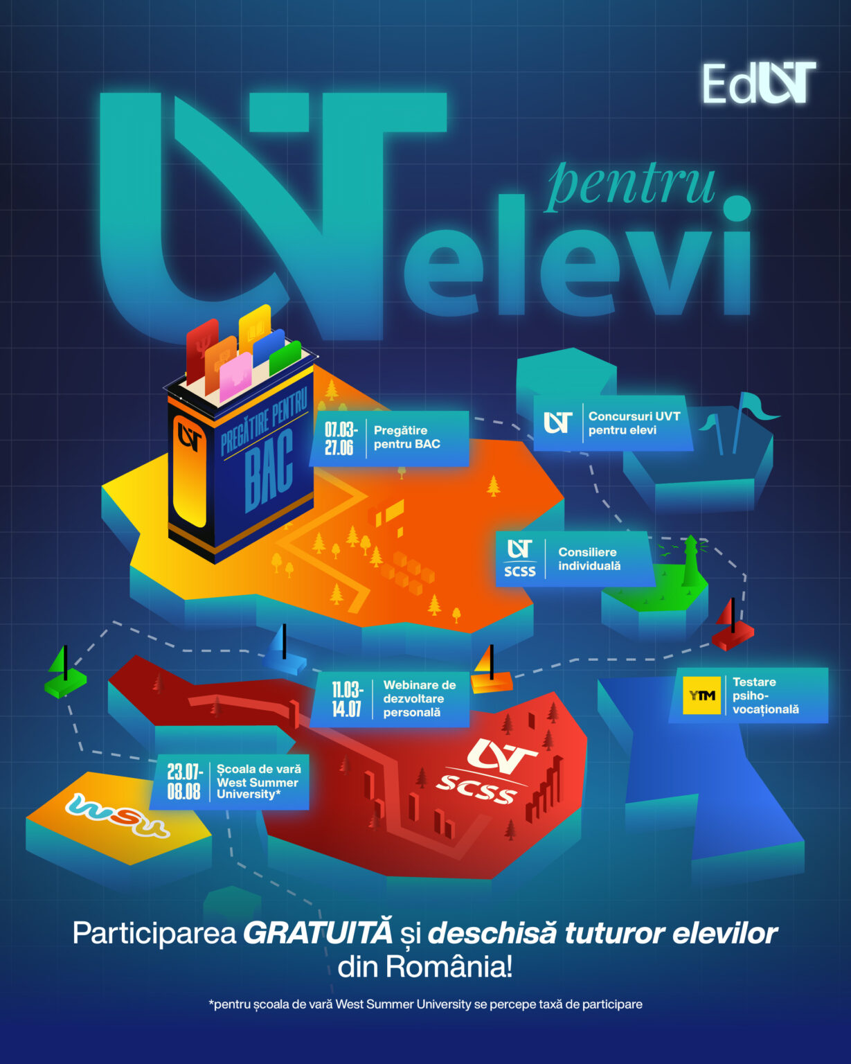 Universitatea de Vest din Timișoara (UVT) continuă și în anul 2026 programul de sprijin pentru elevii din întreaga țară, format din sesiuni de pregătire pentru examenul de bacalaureat, concursuri dedicate elevilor, webinare de dezvoltare personală și consiliere individuală în carieră.