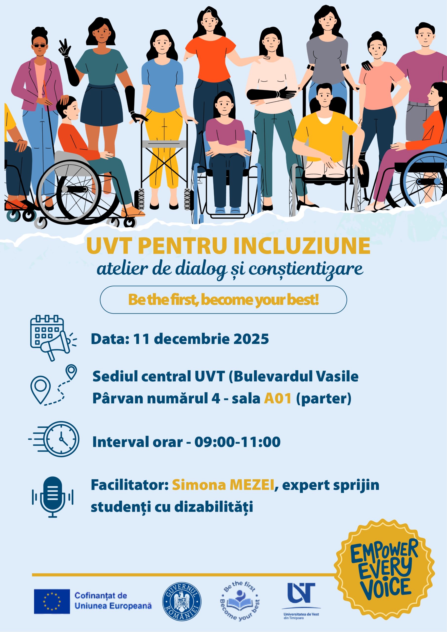 UVT organizează, în cadrul proiectului „Be the first, become your best!” (Programul Educație și Ocupare 2021-2028, cod MySMIS: 323824), evenimentul UVT pentru incluziune – Atelier de dialog și conștientizare, care se va desfășura în data de 11 decembrie 2025, începând cu ora 9:00, în amfiteatrul A01 al sediului central UVT (marcând cu această ocazie și Ziua Internațională a Persoanelor cu Dizabilități, care a fost celebrată în data de 3 decembrie).