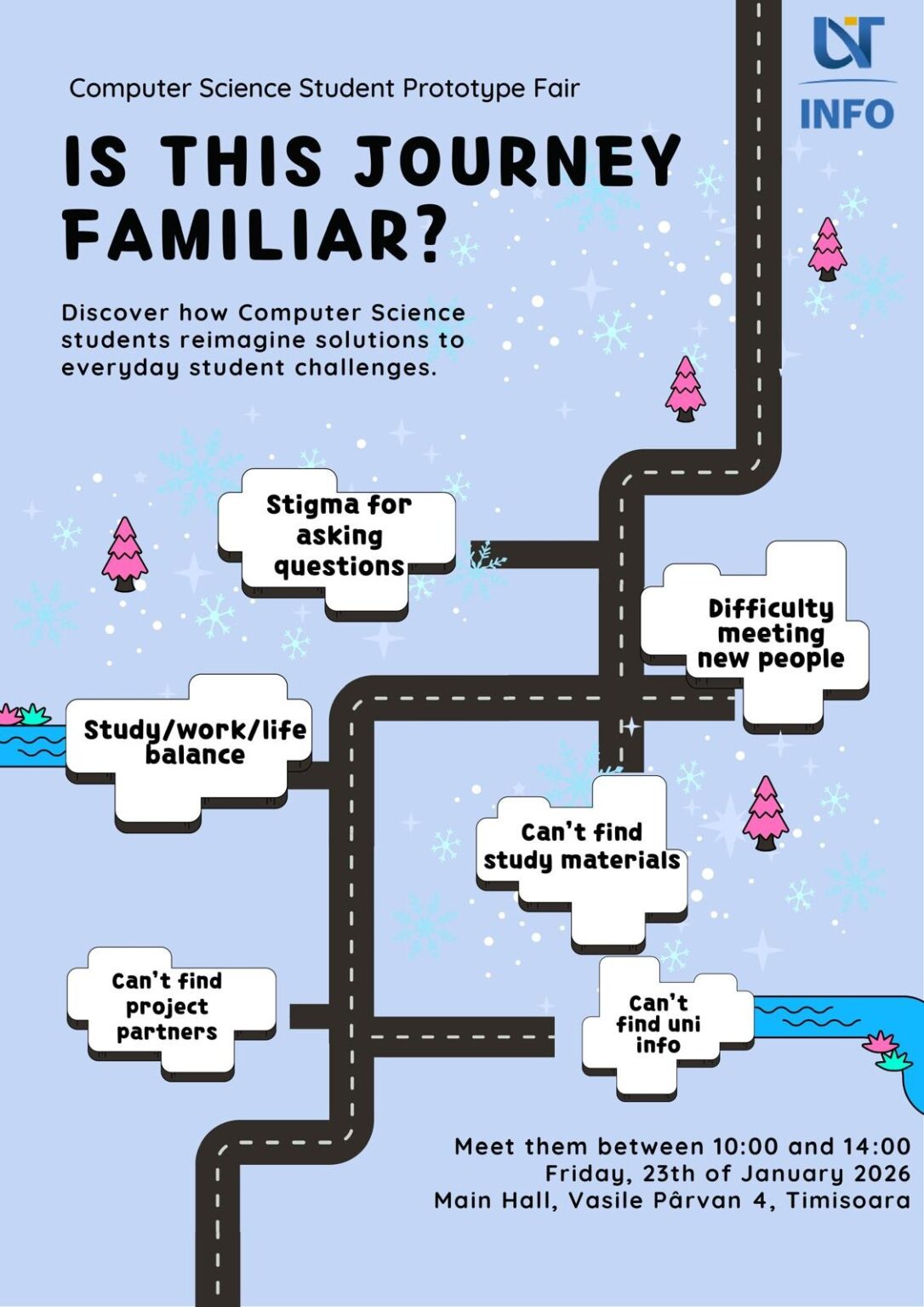 Evenimentul va avea loc vineri, 23 ianuarie 2026, în intervalul 10:00–14:00, parter UVT (bd. Vasile Pârvan, nr. 4) și reunește studenți de la programele Computer Science (engleză) și Artificial Intelligence (engleză), care își vor prezenta prototipurile dezvoltate în cadrul disciplinelor Programming I (Python) și Programming III (Java).