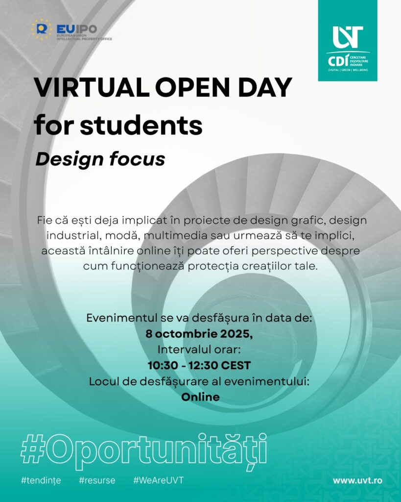 Universitatea de Vest din Timișoara, membră a rețelei PES Universities, continuă să ofere studenților săi acces la inițiative internaționale valoroase. Una dintre acestea este Virtual Open Day on Design, eveniment organizat de EUIPO – Academic Initiatives Team, care va avea loc online în data de 8 octombrie 2025, între orele 11:30 – 13:30.